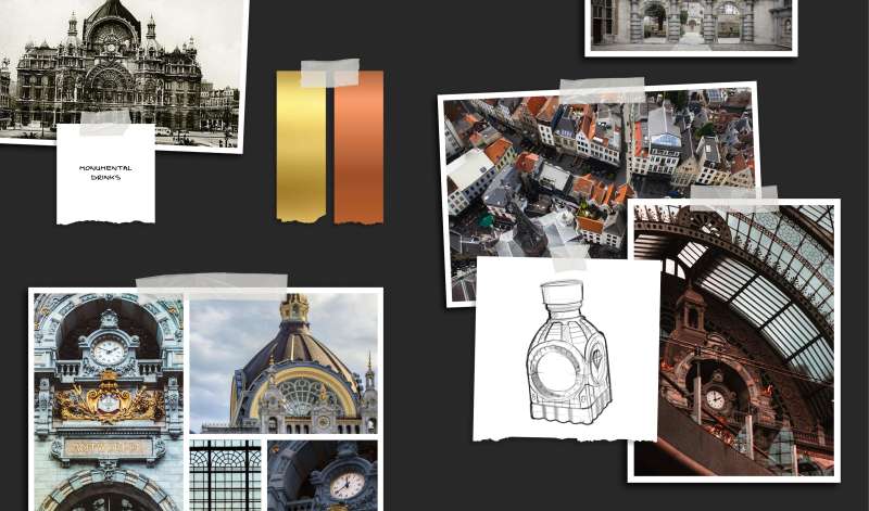 MM’s bottle’s design features the monumental details of the Central Station, rising above the water of ‘t Scheldt, and Antwerp’s traditional royal crest. The centerpiece of the bottle is the station clock, which we translated into the bottle’s label. The colors of each label were carefully chosen to evoke the distinct flavor profiles of each distillate.